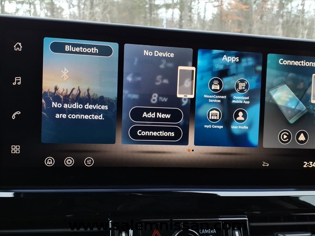 - Radio: AM/FM Audio System w/NissanConnect -inc: 6 speakers, 5G Wi-Fi hotspot, wireless Apple CarPlay and Android Auto, 12.3" center touch-screen display, SiriusXM satellite radio, 2 front USB connection (1 type C charge and data ports), Bluetooth® hands-free phone system, streaming audio and messaging and hands-free text messaging assistant