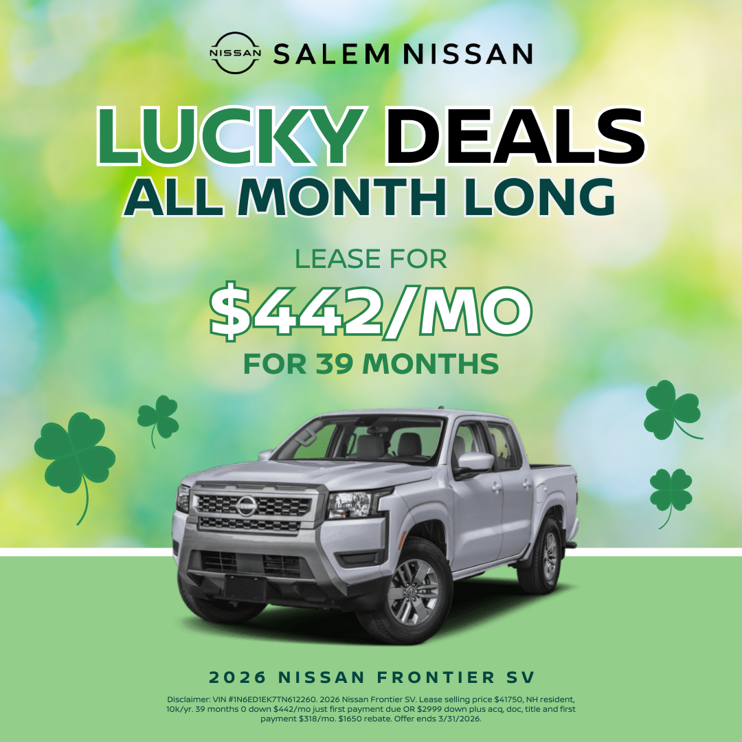 VIN #1N6ED1EK7TN612260. 2026 Nissan Frontier SV. Lease selling price $41750, NH resident, 10k/yr. 39 months 0 down $442/mo just first payment due OR $2999 down plus acq, doc, title and first payment $318/mo. $1650 rebate. Lease requires first month’s payment plus applicable fees. Title, doc, registration, and admin fees additional. Based on tier-one credit approval through NMAC. Subject to incentives and rebates. Offer ends 3/31/2026.